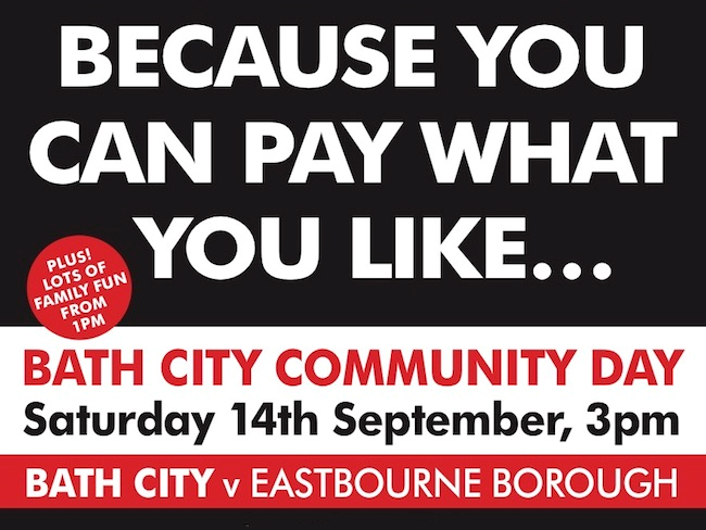 A reminder that this Saturday Bath City Football Club is inviting everyone in Bath to kick off a new tradition by coming along to its annual “pay what you like” Community Day fixture generously supported by BWW Communications.