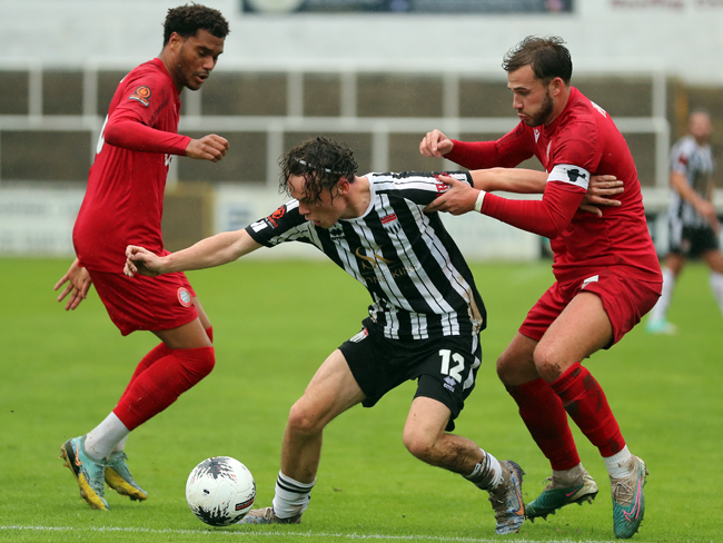 Twice in the opening minutes Luke Russe came close to opening his account for the Romans, seeing one shot deflected onto the bar then flashing another long range effort narrowly wide. After these early escapes the visitors began to dominate the ball but it was largely possession for it’s own sake with little in the way of a threat up front. Just past half hour mark City were denied a clear penalty when Scott Wilson was hauled to the ground by Rea then three minutes later keeper Rees spilled Jordan Thomas’ shot but recovered brilliantly to deny Wilson from the rebound. On 45 minutes Danny Greenslade unleashed a stunning strike from 35 yards that Rees turned around the post at full stretch. So, it was very much against the run of play when, in the final minute of stoppage time, a diagonal ball picked out Agular to fire past Will Buse and put Worthing in front.